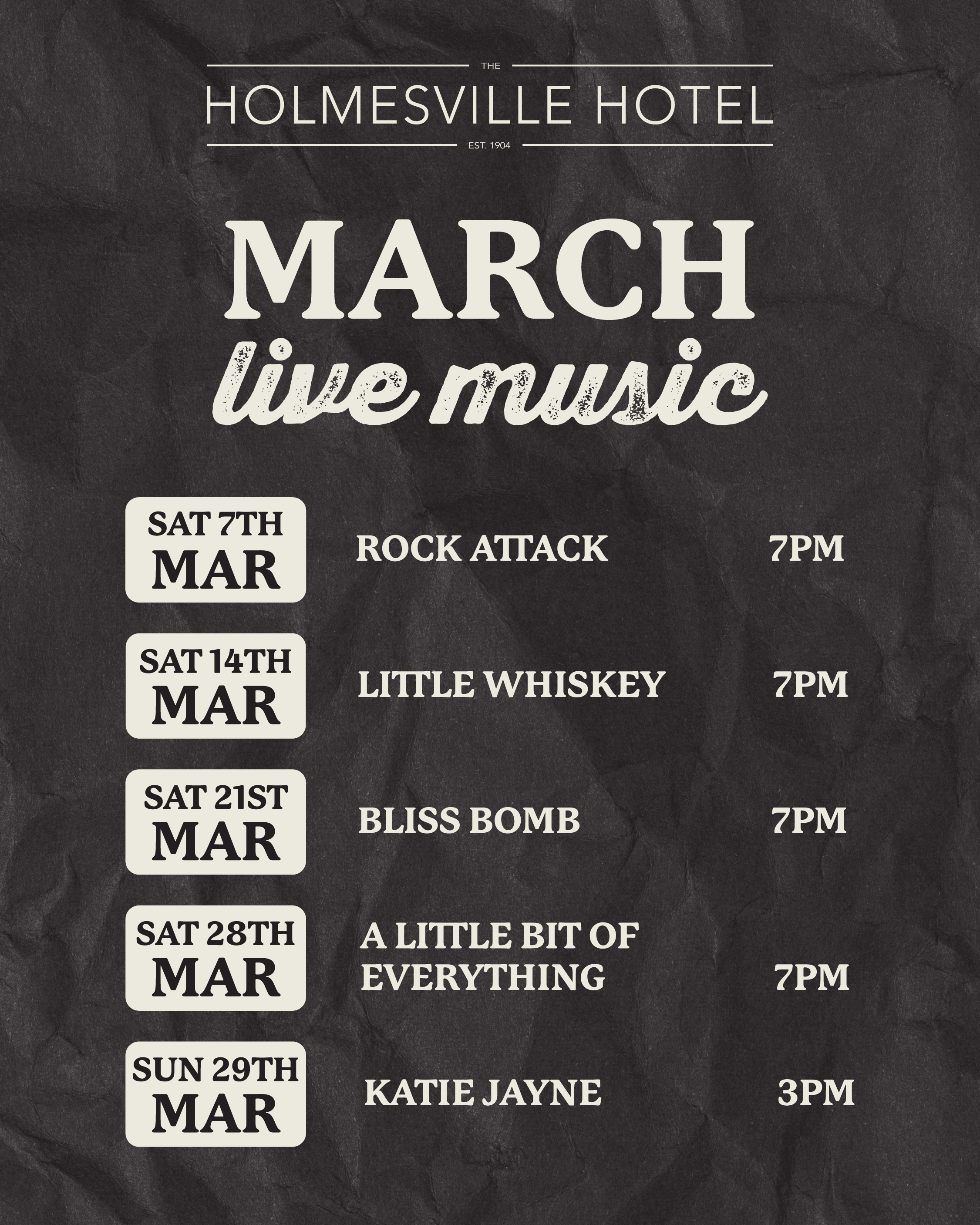 FOLLOW US ON SOCIALS TO STAY UP TO DATE WITH OUR WEEKEND LIVE MUSIC & EVENTS